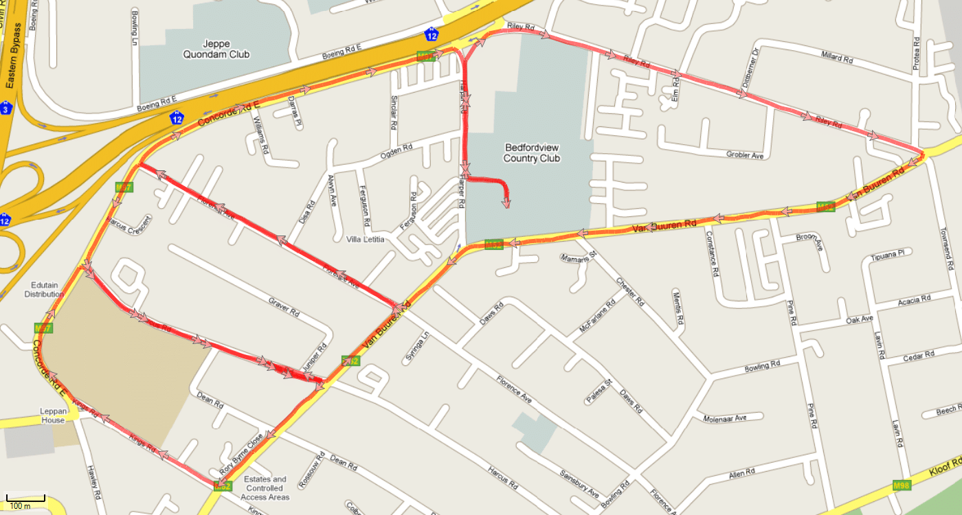 Edenvale Sports Club Boeing, over van Reebek, left into Hurlivale past the front of Edenvale Sports Club, left de Wet,
