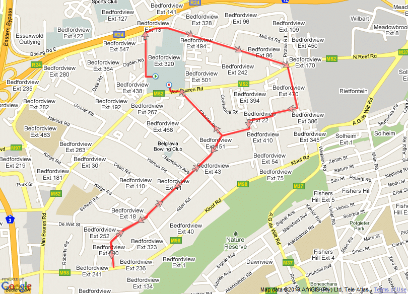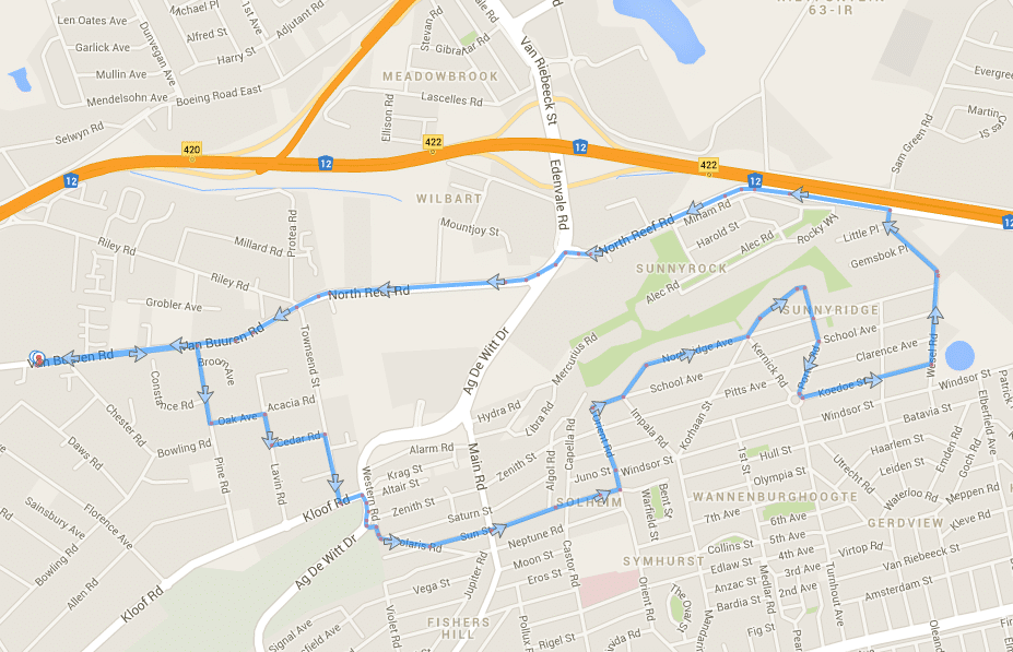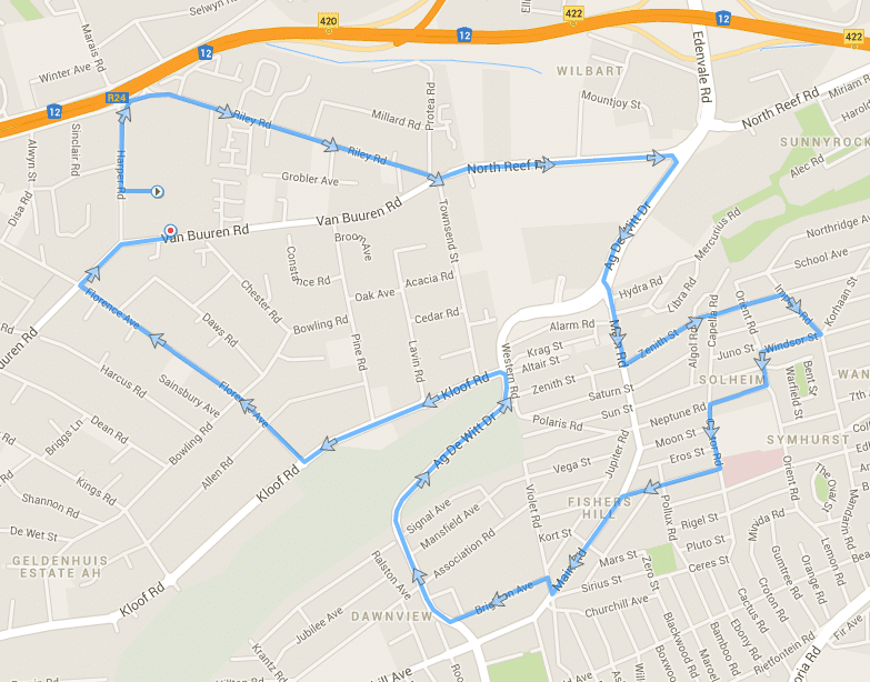 Sunnyridge Left Van burren, right Pine, left Oak, right Lavin, left Cedar, right Townsend, left Kloof, right AG de Wit, left Western/Polaris, left Sun, left Orient, right School, left Northridge, left Korhaan (becomes Porter), left at circle into Koedoe, left Wessel, left North Reef, left Van Burren 9   VIEW MAP