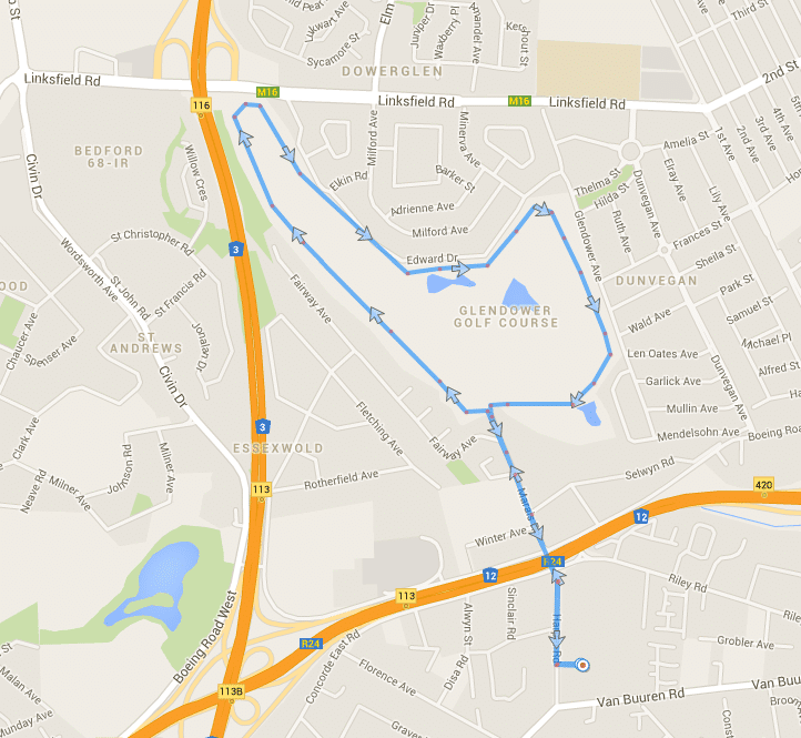 Linksfield Boeing, left Dunvegan, left Linksfield, left Civin, under Freeway, left Penhurst, right Fairway, to club 10   VIEW MAP